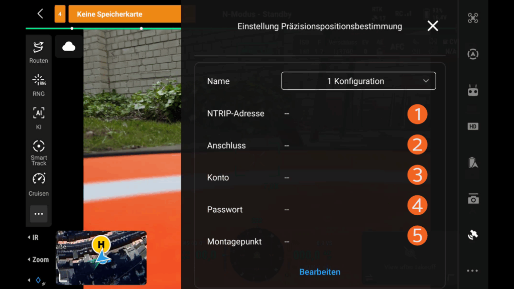 In der Kameraansicht der PilotApp2 rechts oben in das Einstellungsmenü (Symbol mit drei Punkten) wechseln und dann rechts in der Leiste auf das Satellitensymbol klicken. Danach unter RTK-Servicetyp die Option Benutzerdefiniertes Netzwerk-RTK auswählen und die folgende Konfiguration eintragen.