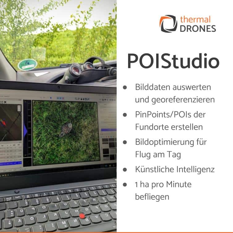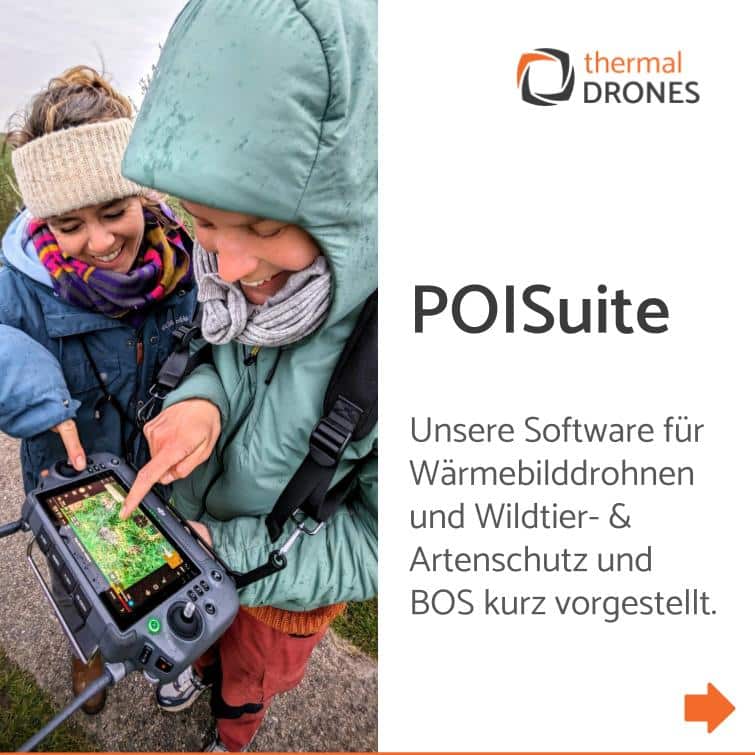 Unser Softwarepaket POISuite ermöglicht eine bis zu 5-fach höhere Flächenleistung und eine zuverlässsige Suche auch am Tag. Für ein schnelles, effizientes und sicheres Arbeiten bei der Wildtierrettung, Brutvogelschutz und BOS.