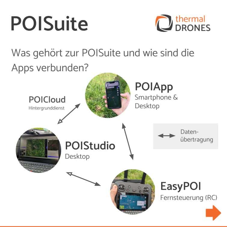 Mit der POISuite sind alle unsere Apps (POIStudio, POIApp, EasyPOI) miteinander vernetzt und Informationen gelangen sofort von der Fernsteuerung zum Smartphone und auch wieder zurück.
